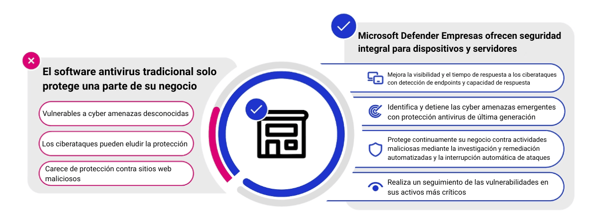 Las soluciones antivirus tradicionales ofrecen a las empresas protección limitada y las dejan vulnerables a ciberamenazas desconocidas, sitios web malintencionados y ciberatacantes que pueden evadir fácilmente la detección. Microsoft Defender para Empresas es una solución rentable y fácil de usar que ofrece seguridad integral de dispositivos y servidores con detección y respuesta de puntos de conexión, antivirus de próxima generación, corrección e investigación automatizada, así como la capacidad de hacer un seguimiento de las vulnerabilidades y corregirlas.